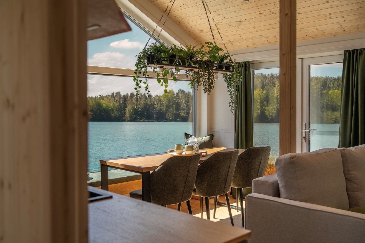 Pierwszym elementem są przeszklenia. Duże, dobrze zaprojektowane okna otwierają wnętrze na otoczenie, wprowadzają naturalne światło i nadają przestrzeni głębi. W tiny house pełnią one dodatkową rolę, optycznie powiększając wnętrze i budując relację z krajobrazem.